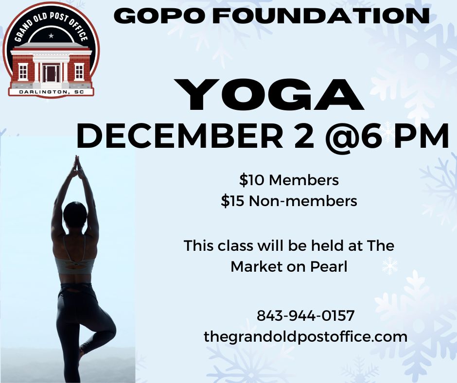 Join us for a yoga class! Susan Weesner will be our instructor. December 2nd @ 6PM. Please come join us!
