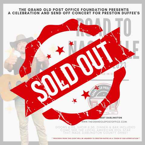 The Grand Old Post Office Foundation is proud to welcome Preston Duffee to our stage June 14, 2023! Preston advanced to national fame as a contestant on American Idol. He will be leaving in June to pursue his dream of a recording artist in Nashville. All proceeds from this concert will be awarded to Preston as a token of our appreciation for making Darlington County shine to the world. The tickets are $100. We will only sell 100, and Preston will autograph each one. Dinner and bar included in the price. Doors open at 6PM and the show starts at 6:30PM. We look forward to seeing you at The Grand Old Post Office!